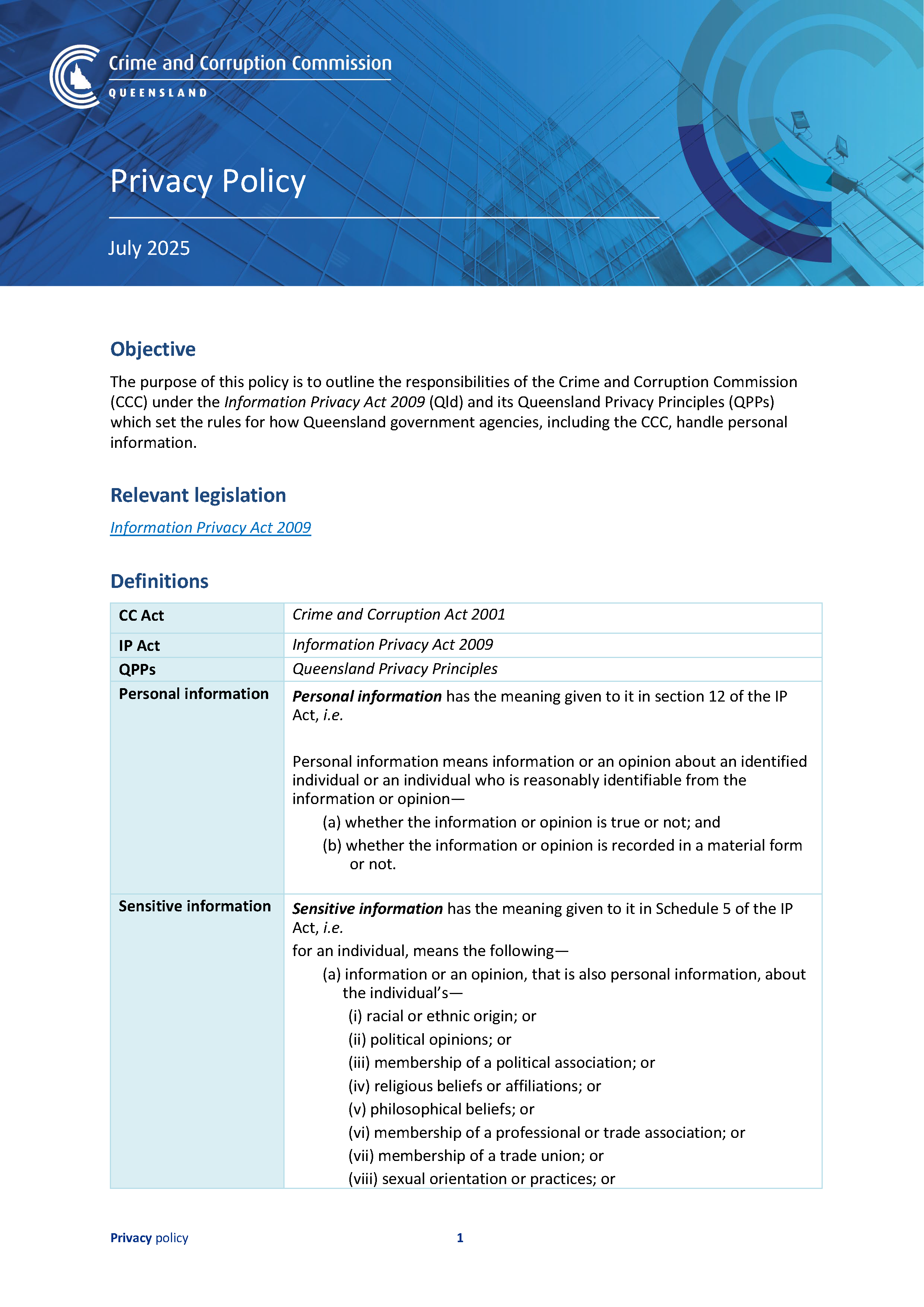 The purpose of this policy is to outline the responsibilities of the CCC under the Information Privacy Act 2009 (Qld) and its Queensland Privacy Principles (QPPs) which set the rules for how Queensland government agencies, including the CCC, handle personal information.