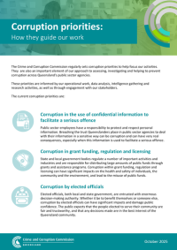 The CCC regularly sets corruption priorities to help focus our activities. They are also an important element of our approach to assessing, investigating and helping to prevent corruption across Queensland's public sector agencies.