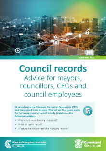 This joint corruption prevention advisory from the Crime and Corruption Commission and the Queensland State Archives, outlines the importance of recordkeeping for councils, defining public records and management requirements. It addresses the following questions: